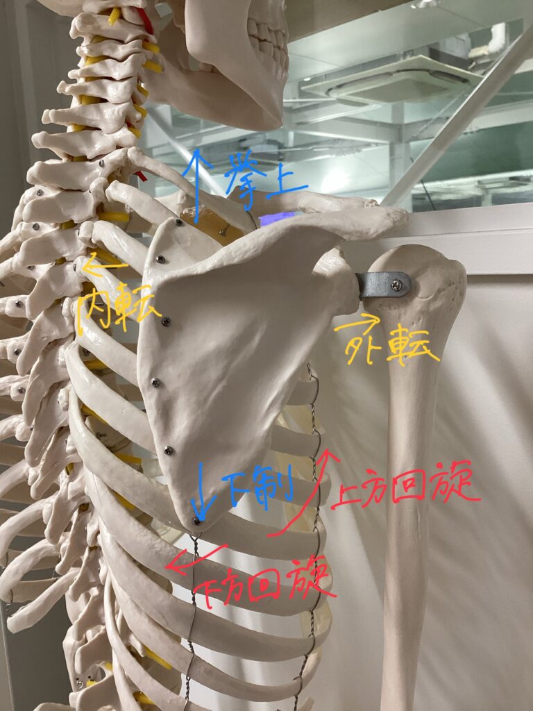 5. 上方回旋(じょうほうかいせん):腕を上げる際に、肩甲骨が外側を向くように回転します。